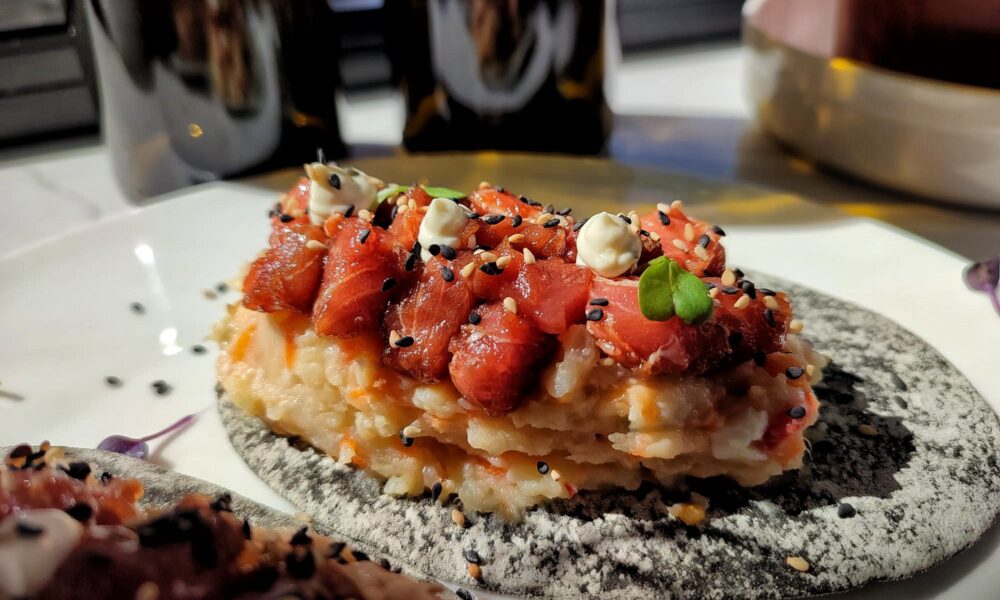 Base de aguacate, atún rojo macerado en soja con cebolla y tomate.