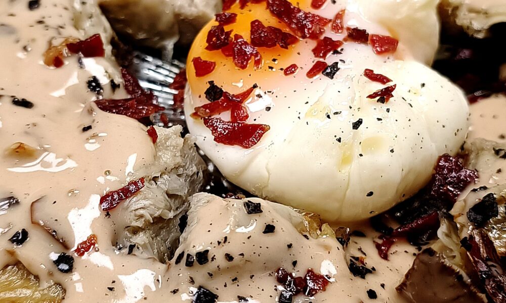 Alcachofas al horno con crema de boletus y setas, huevos poché y virutas de jamón